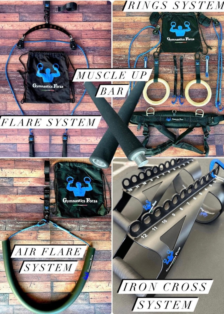 Presentamos el Gymnastics Forza Elite Bundle All-In-One, la cúspide de los kits de entrenamiento diseñados para atletas de todos los niveles que aspiran a sobresalir en gimnasia, calistenia y breaking. Este paquete integral incluye todo lo que necesitas para llevar tus habilidades al siguiente nivel, con el Gymnastics Forza Rings System, Flare System, Air Flare System, Iron Cross System y la innovadora Muscle Up Bar.