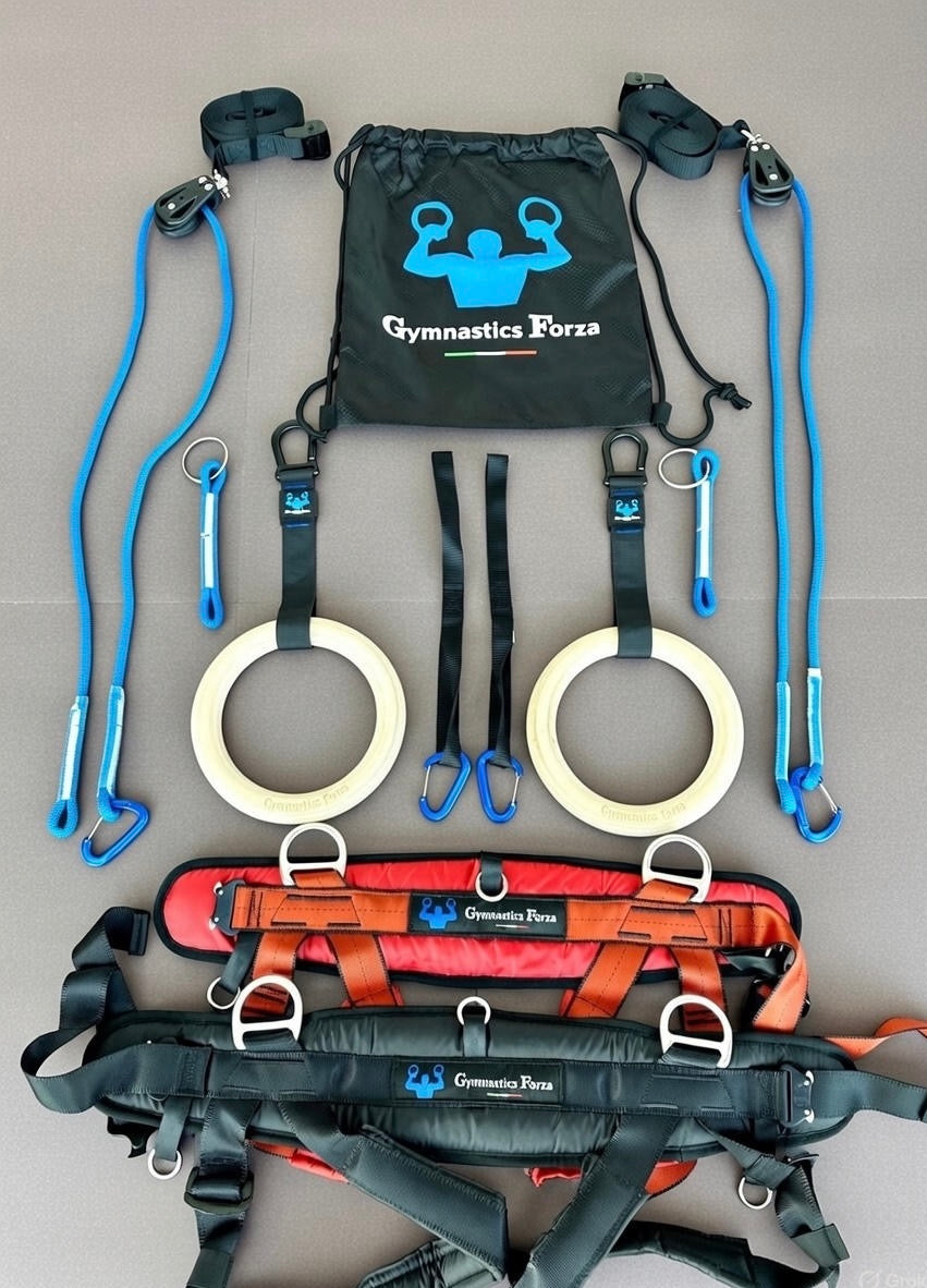 • Entraînement complet : Comprend le Gymnastics Forza Rings System, Flare System , Air Flare Système, Iron Cross Système, Barre Muscle Up et un harnais taille enfant.