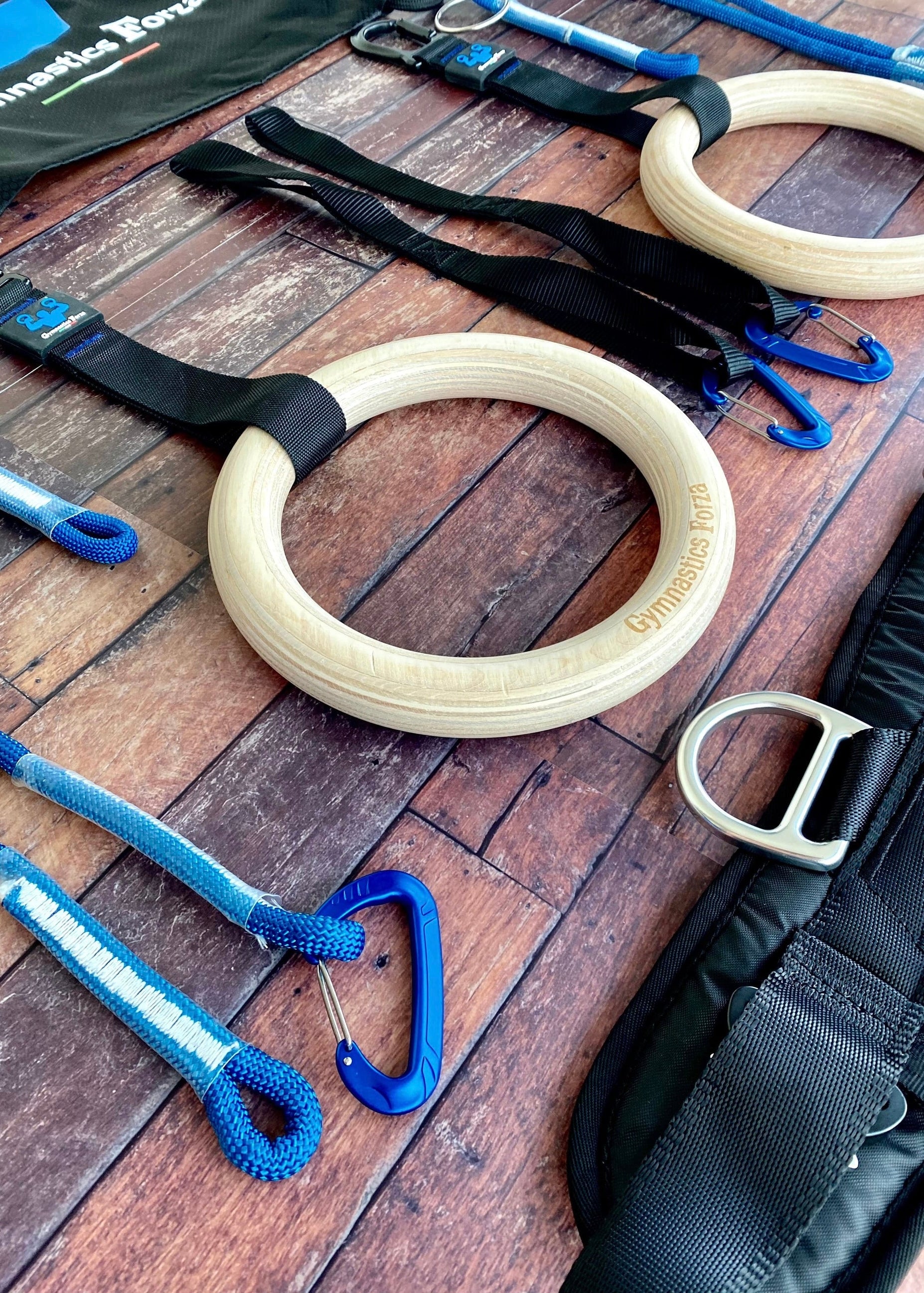 • Twee houten rings: 32 mm met banden van 20 cm en karabijnhonden bevestigd