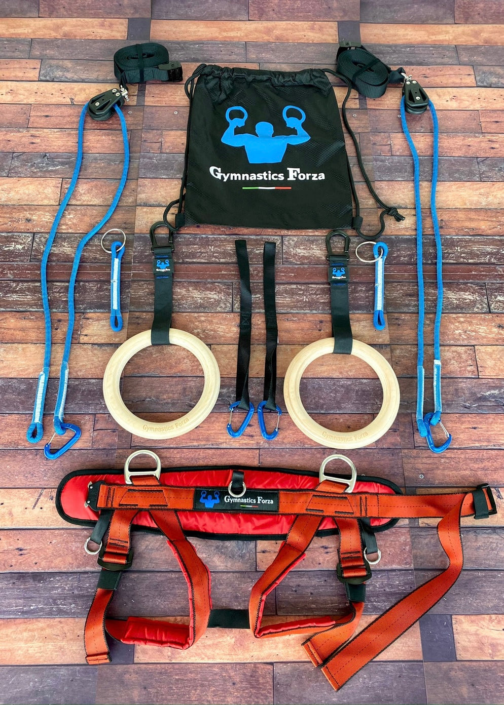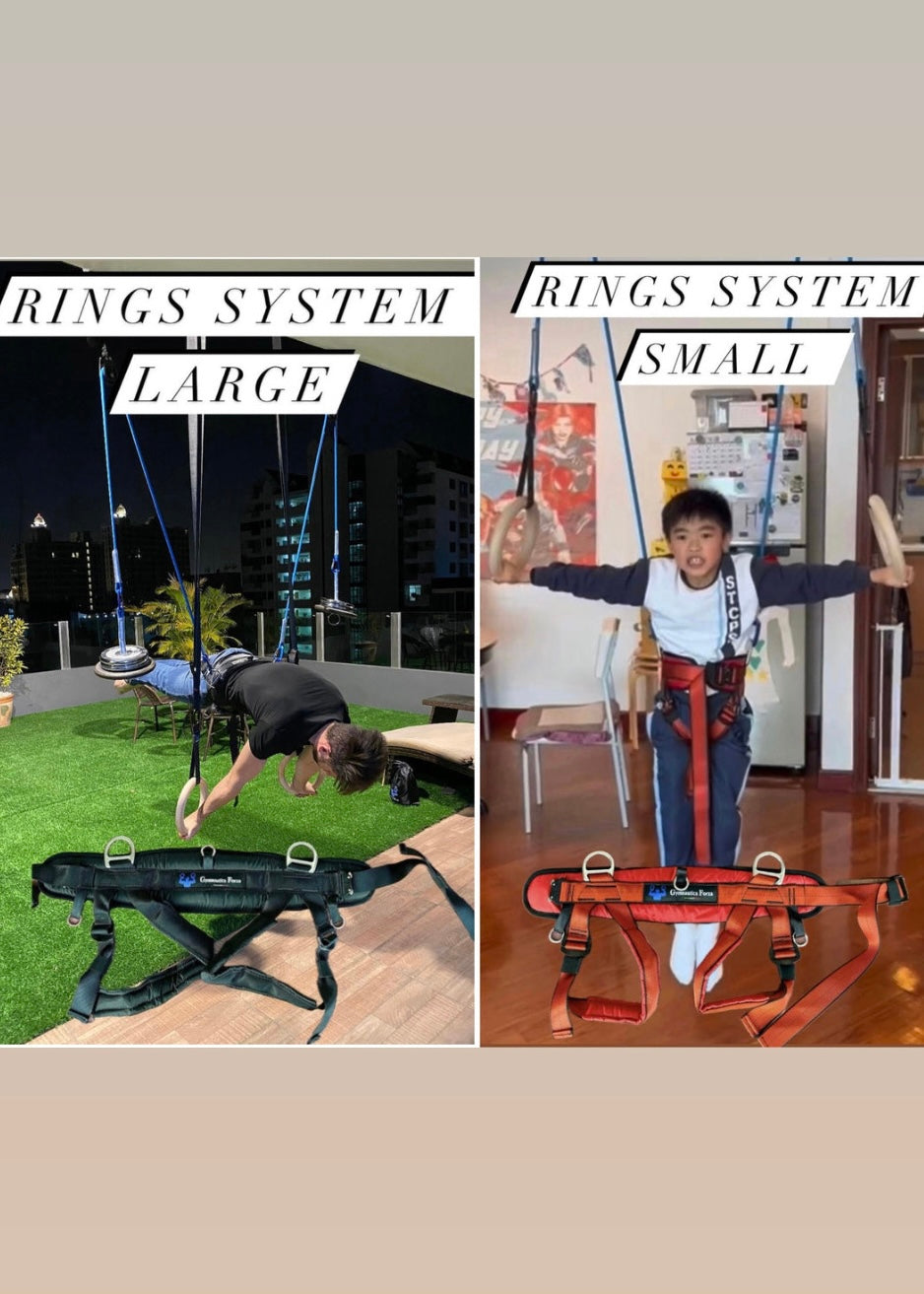 The Gymnastics Forza Ring System Bundle is designed for families and gyms looking to provide a comprehensive training experience for all ages. This unique bundle includes two full ring systems—one featuring a large adult harness and the other equipped with a small harness suitable for children.