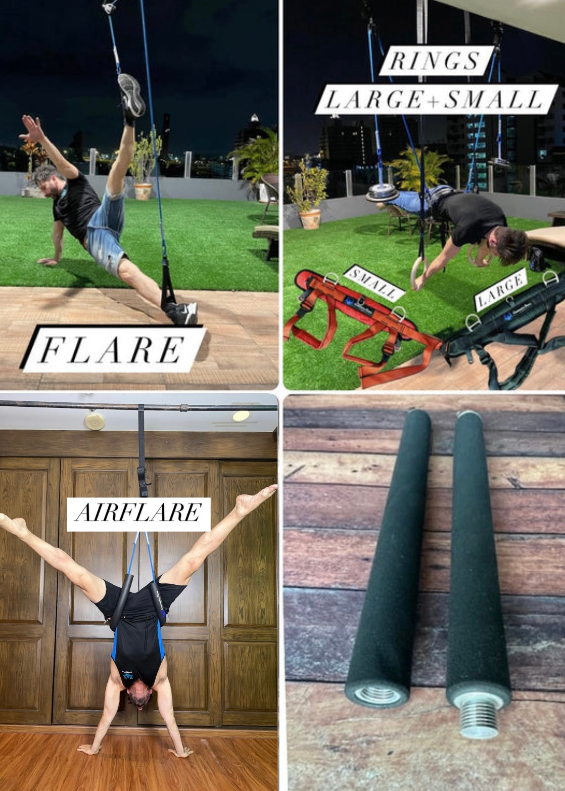 BUNDLE 8 ( SAVE 261 USD) muscle up bar+ air flare + flare + rings system( large and small harness)